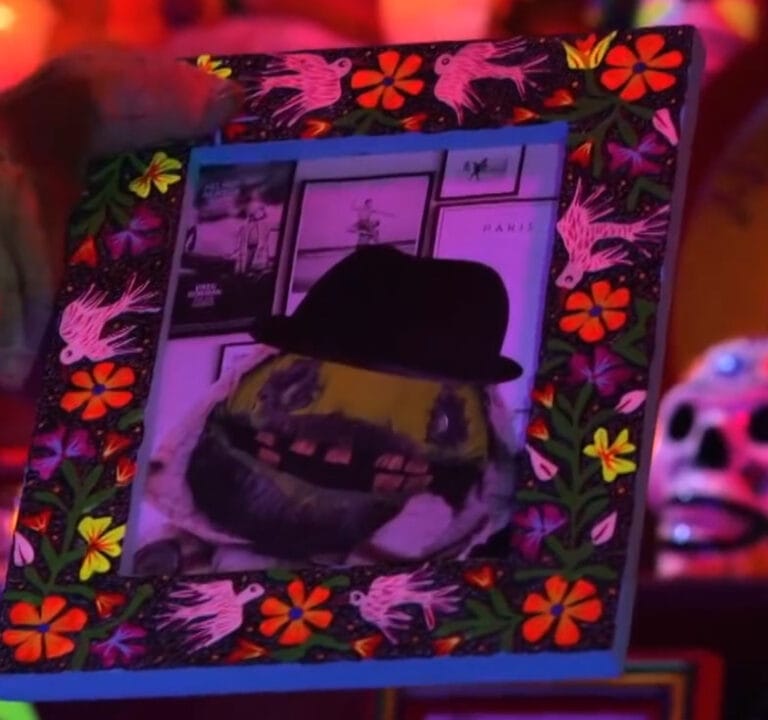 Regresando a la pista de la ofrenda en la foto, en la esquina superior izquierda aparece un coche y un hombre, quizás en referencia a algún piloto que falleció.