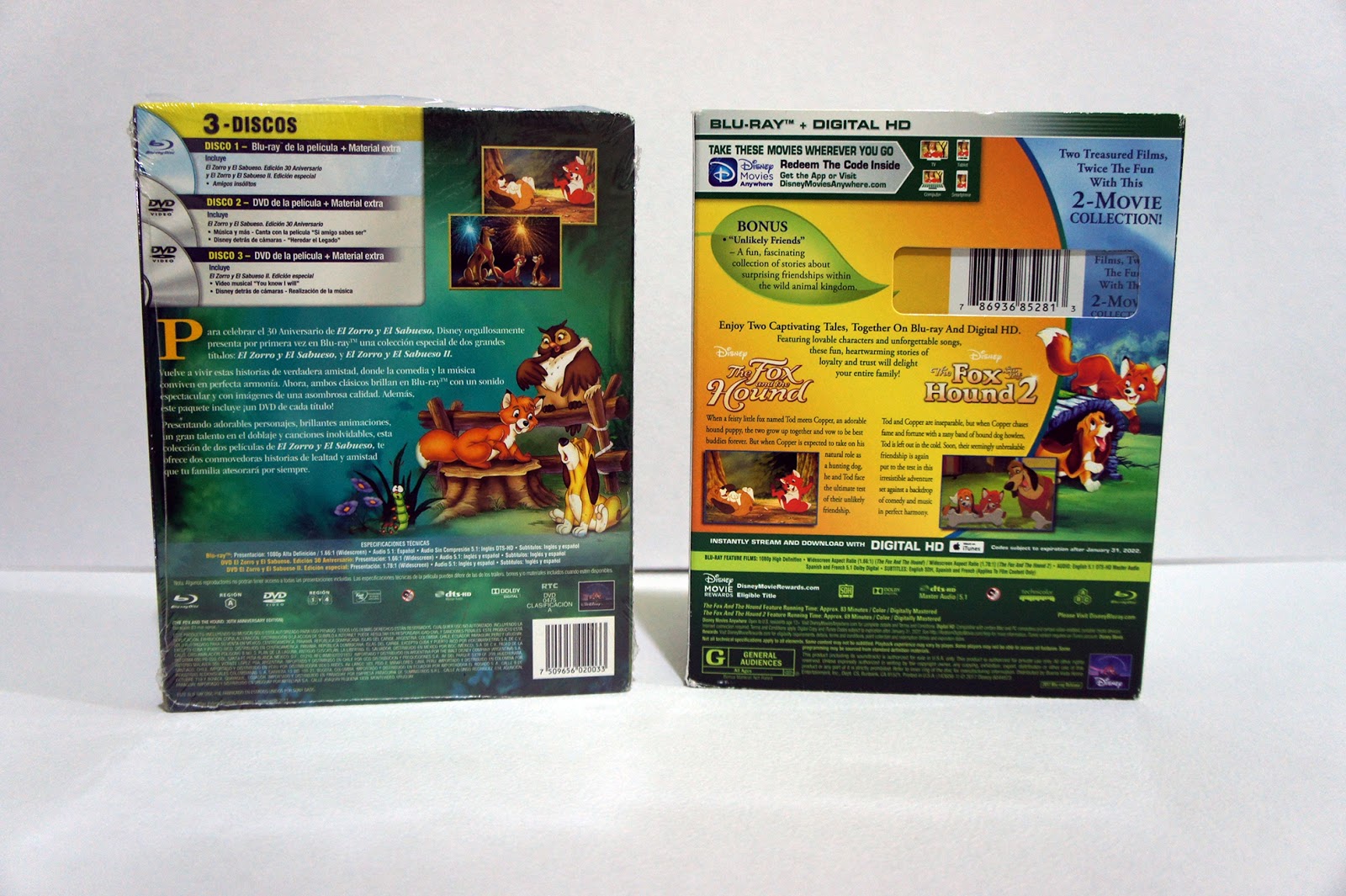 Galería de fotos del blu-ray de la película El Zorro y El Sabueso, son tres diferentes presentaciones, una importada editada en enero de 2017 y dos ediciones nacionales, una presentación que incluye tres discos y la otra uno, todas las presentaciones incluyen la secuela.