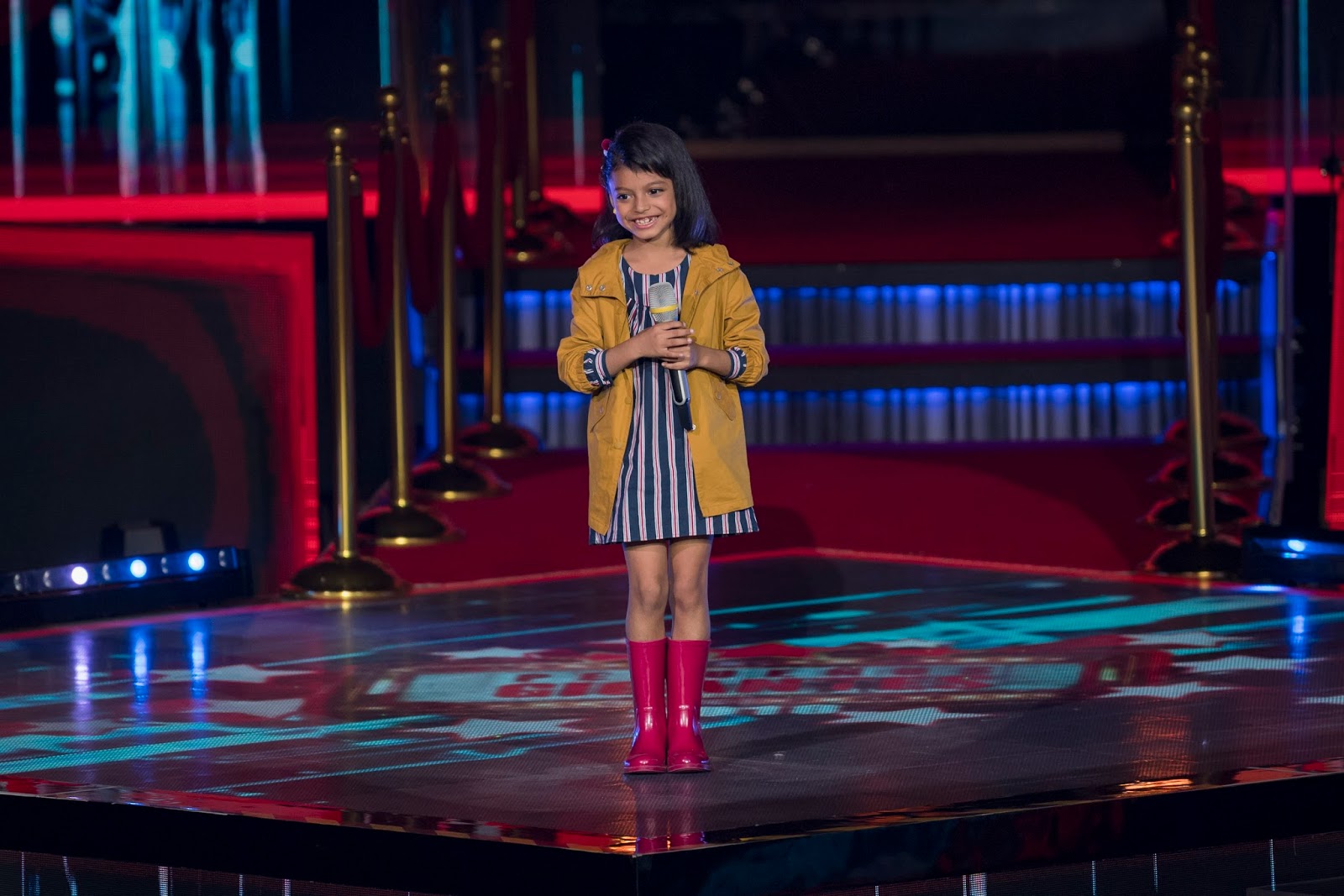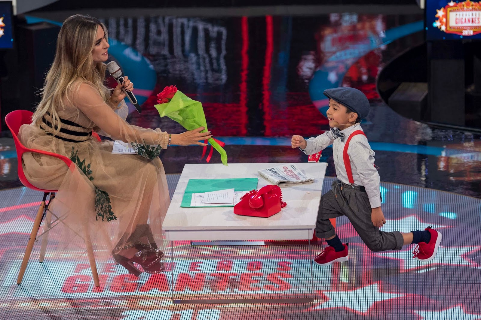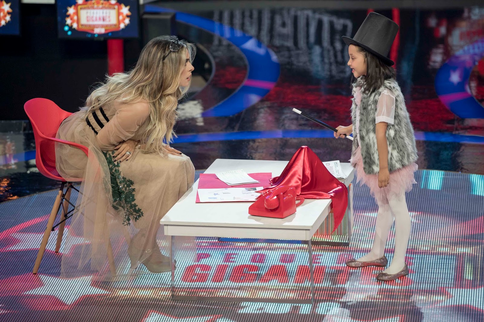 Para dar inicio a la primera gala de esta nueva emisión de Pequeños Gigantes, se presentó a Andrea, niña que participará a lo largo del programa como asistente personal de Galilea Montijo, y que arrebató más de una carcajada, al presentarse vestida con el mismo atuendo de la conductora.